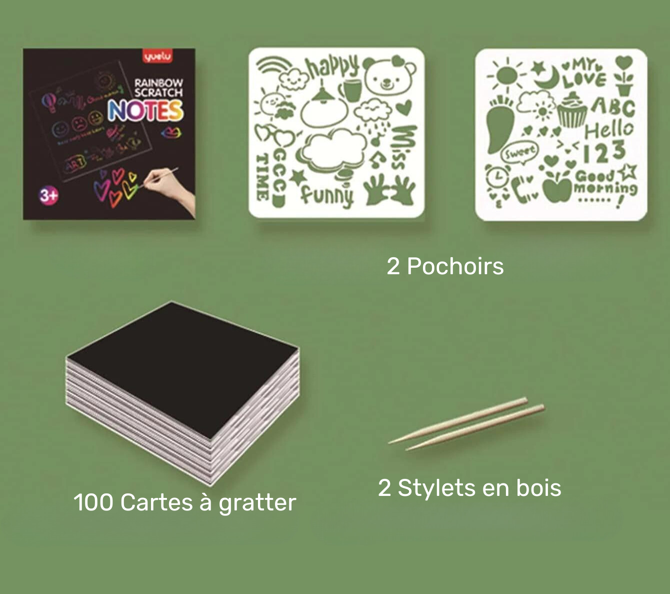 Un pack pour des heures de création: feuilles, stylets et pochoirs inclus.