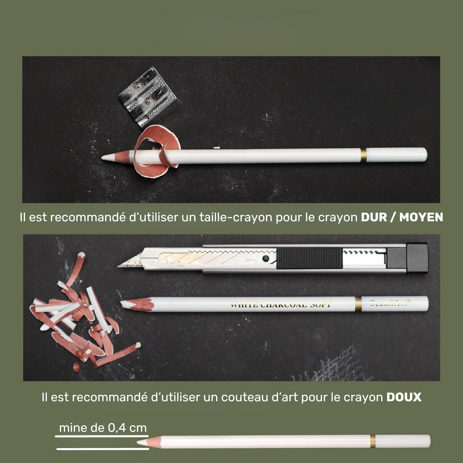 Moyen et dur au taille-crayon; le doux se taille au couteau artistique pour éviter les cassures.