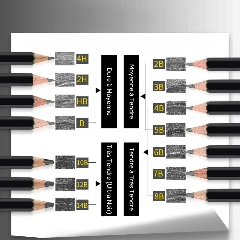 Passez facilement du 4H pour les tracés légers au 14B pour des ombres denses et un contraste maximal.