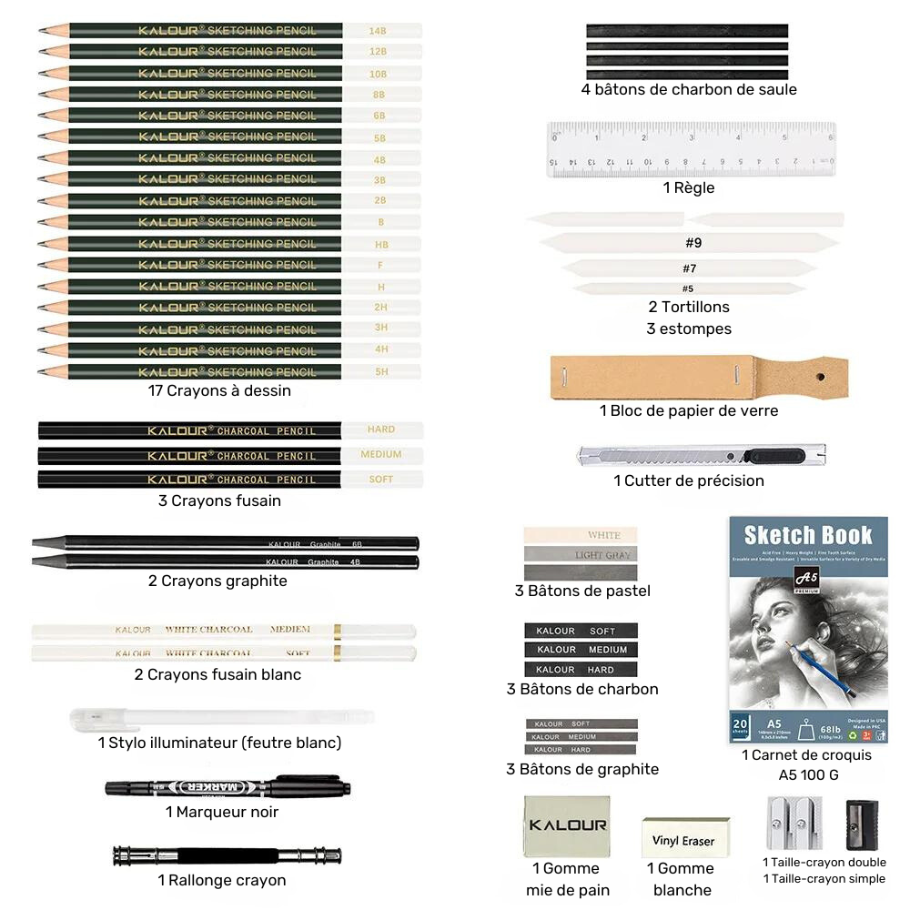 Kit complet de dessin 54 pièces – crayons 5H à 14B, fusains, pastels, carnet croquis A5 et sacoche. Tout-en-un pour débuter et progresser. Livraison gratuite.