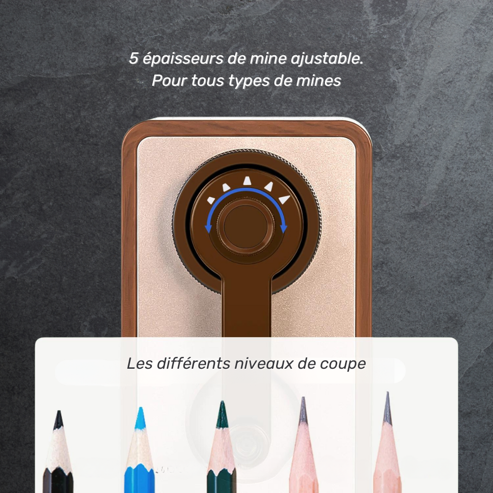 Choisissez une pointe longue pour le dessin détaillé ou plus courte pour l’écriture: une molette ajuste la profondeur d’affûtage.